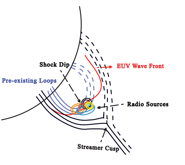 Illustration 3. Sketch of the shock-loop system with the dip region and the corresponding type-II radio sources. (source: The Authors).