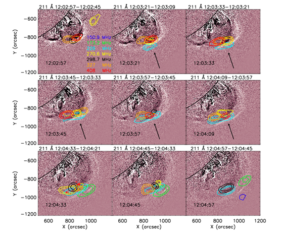 By over-plotting the 90 and 95% contours of TBmax onto the closest-in-time AIA 211 Å running difference images (see Illustration 2), we made four observations: (1) the type-II sources are co-spatial with the nose front of the EUV shock wave structure (being slightly separated, by 0.01 Rʘ; (2) the sources basically overlap with each other before 12:04 UT (without spatial separation 0.001 Rʘ; later they become spatially dispersed, with lower-frequency sources being farther away from the disk; (3) as already mentioned, the sources at several frequencies appear simultaneously, and they distribute within a broad region of 150 ̶ 200 arcseconds; and (4) during most time of the burst, the sources are spatially dispersed yet still centered around the dip of the shock front that corresponds to the CME-shock transit across the bright dense loop tops.