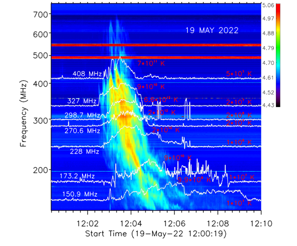 Na ilustracji 1: Widmo dynamiczne szerokopasmowego wybuchu typu II na wysokiej częstotliwości zarejestrowane przez spektrograf radiowy ORFEES (670–144 MHz). Maksymalne temperatury jasnościowe (TBmax) dla różnych częstotliwości NRH zaznaczono białymi liniami (Publikacja Zespołu).